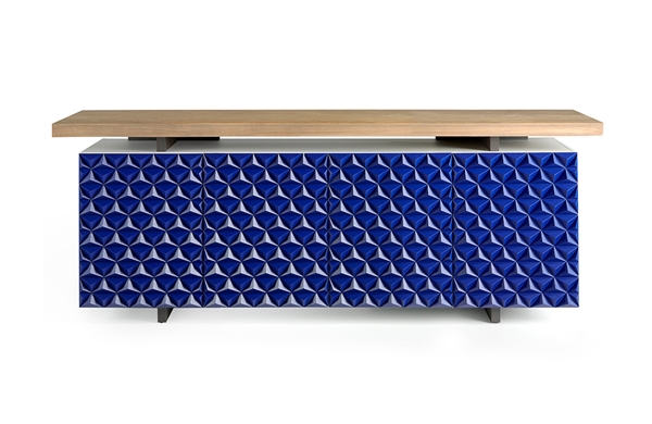 Aparador dallas con la tapa fabricada en madera de Roble marinado, el casco en madera de Fresno en C/185 Blanco Encalado y las puertas piramide en color C/216 Azul Eléctrico. Este aparador está caracterizado por tener 4 puestas con detalles de pirámide en relieve.