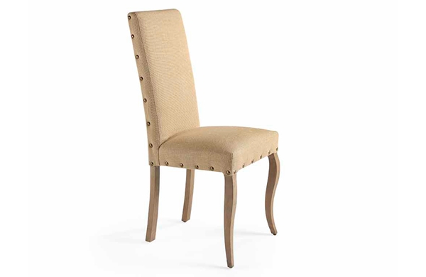 Silla tapizada con tela Saco y remachada con tachuelas.