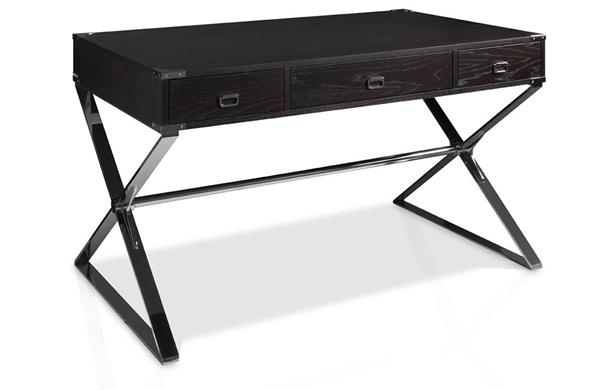Mesa de despacho fabricada en madera de fresno con tres cajones y patas metálicas.