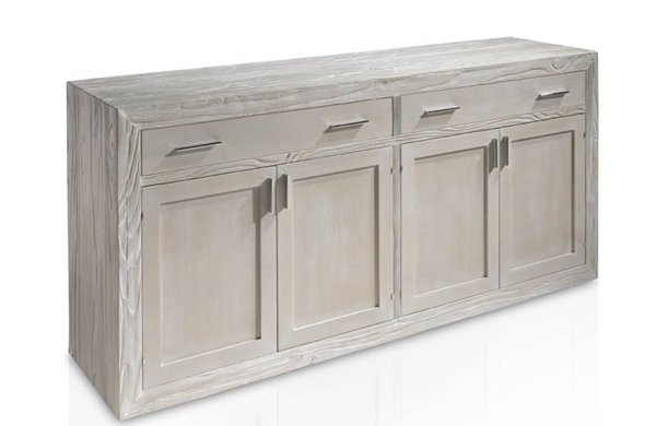 Sideboard with two drawers and four framed doors. Frame of mobila wood eroded by hand. Drawers and door panels of ash wood. Interior wooden shelf. Hinges and handles made of Zamak. Your monitor may not truly represent actual colour matching. The colours displayed on screen may differ from real colours.