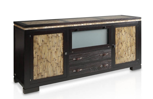 Sideboard of ash wood with three doors and two drawers. Side doors with cane panels and interior wooden shelf. Central hinged door with opaque glass. Drawers eroded by hand. Handles of leather and polished aluminium. Your monitor may not truly represent actual colour matching. The colours displayed on screen may differ from real colours.
