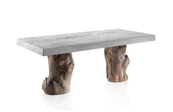 La característica principal de esta mesa de comedor son los dos pies utilizados para su soporte. Troncos macizos tratados y manipulados con técnicas especiales para su conservación.