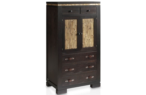 Portes à panneaux en déco canne à sucre, étagère en bois à l’intérieur et deux tiroirs façades en verre. Le réglage de votre écran peut légèrement altérer les coloris. Les coloris qui apparaissent sur votre écran peuvent être différents des coloris réels.