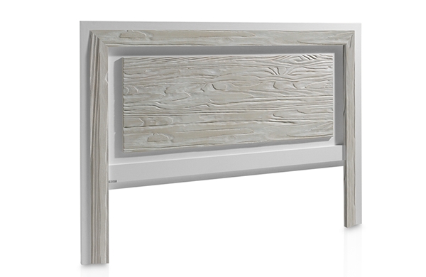 Cabecero con estructura de madera de fresno, plafón central y marco fabricado con madera de mobila erosionada artesanalmente.