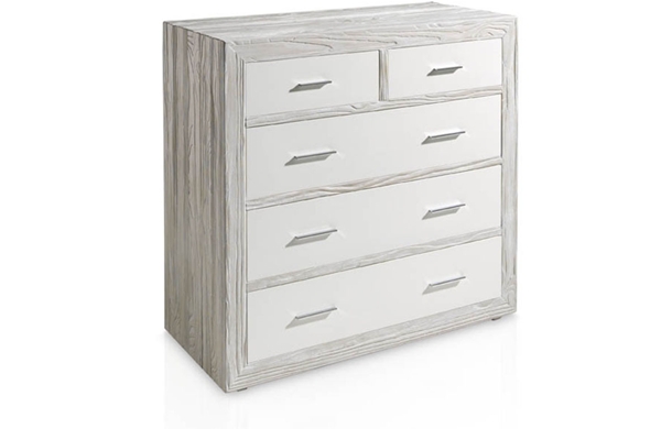 Cómoda de 5 cajones con estructura de madera de mobila erosionada artesanalmente y frentes de cajones en madera de fresno.