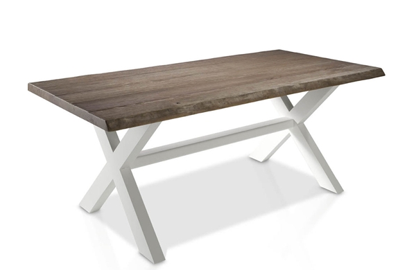 Mesa de comedor con estructura de madera de mobila, con tapa arañada artesanalmente con perfil de tronco natural y juego de patas.