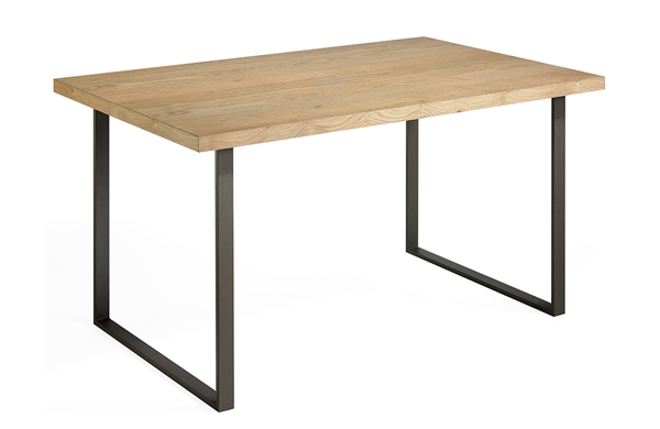Mesa de comedor fabricada en chapa de roble marinado y patas en metal color Óxido marrón.