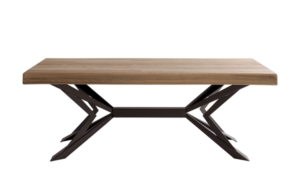 Mesa de comedor fabricada en madera de Fresno de 9 cm de grosor, textura arañada, perfil tronco, forma F2, acabado color 65.