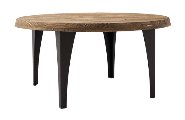 Mesa de comedor fabricada en madera de mobila de 9 cm de grosor, textura erosionada, perfil tronco, forma F3, acabado color 65 Mediterraneo.