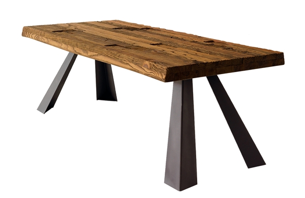 Mesa de comedor fabricada en madera de mobila vieja de 9 cm de grosor, textura erosionada, perfil tronco, forma F2, acabado color 200 Reciclado Ecológico.