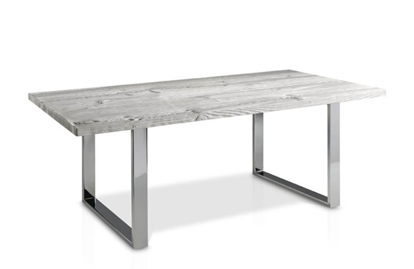 Mesa de comedor con sobre de madera de mobila erosionada artesanalmente con tapa de cristal y juego de patas metálicas.