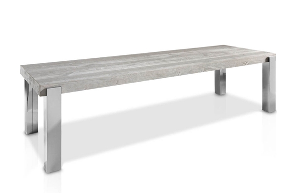 Mesa de comedor con sobre de madera de mobila arañada artesanalmente y juego de patas metálicas.