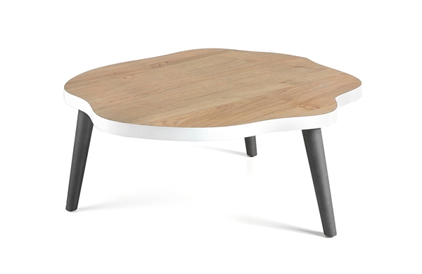 Mesa de centro irregular fabricada en madera de Roble marinado y Fresno.