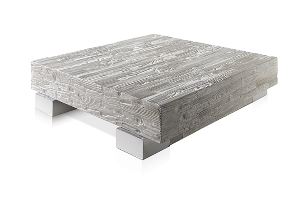 Mesa de centro Palma con estructura de madera de mobila vieja. El sobre de madera de la mesa esta estructurada de forma atamborada y la madera esta erosionada con técnicas especiales.