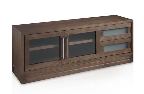 Mueble TV fabricado en madera de fresno, con dos puertas con cristal transparente y estante interior de madera y dos cajones con cristal opaco.