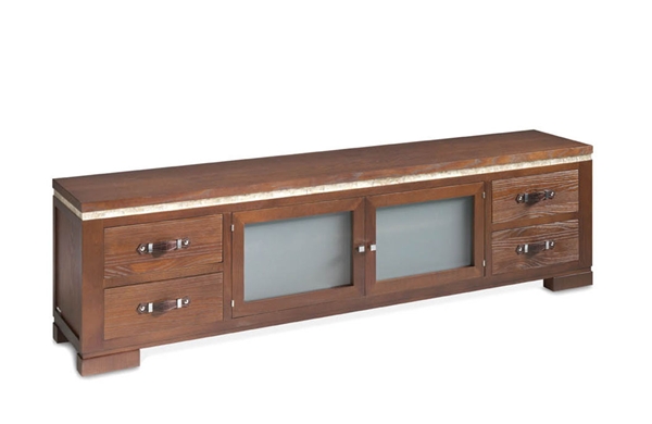 Mueble TV fabricado con madera de fresno con cuatro cajones y dos puertas en cristal opaco.