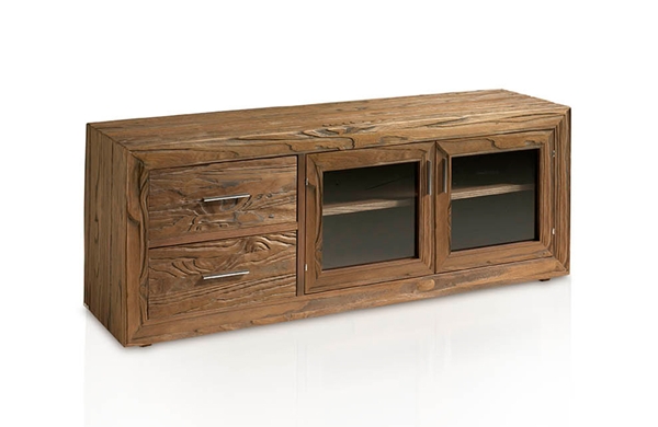 Mueble TV con estrucura, frente de cajones y puertas fabricados en madera de mobila erosionada artesanalmente. Incluye 2 cajones y 2 puertas de cristal transparente con estante de madera en su interior y trasera con hueco para poder pasar los cables.