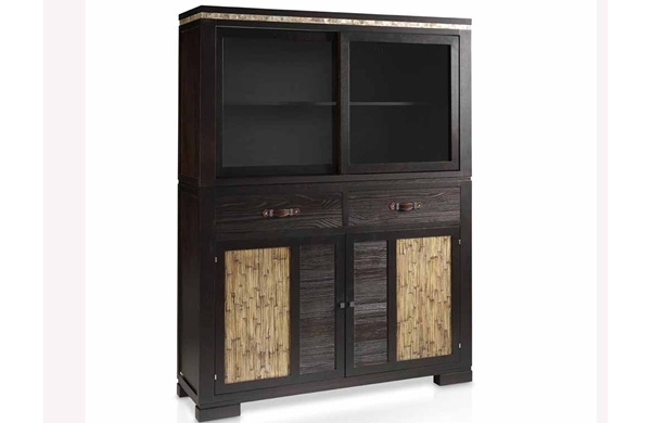 Aparador vitrina dos módulos fabricado en madera de fresno con detalle de nácar incrustado, cuatro puertas y dos cajones.